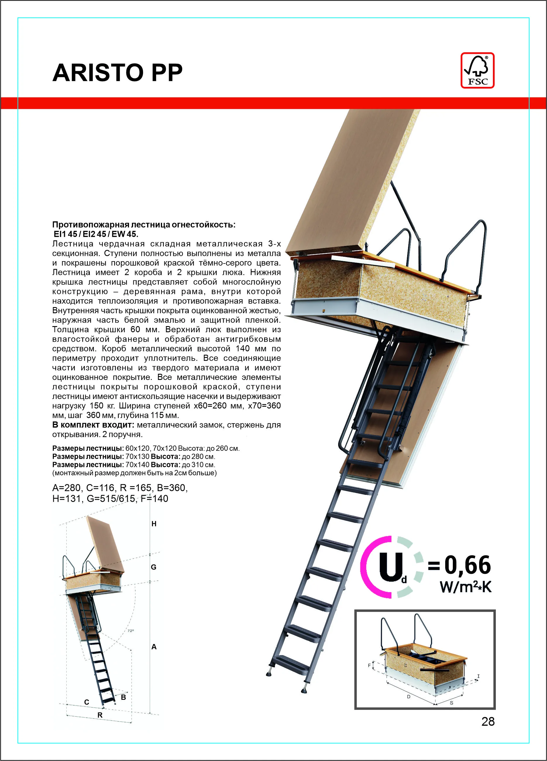 Лестницы с люком на чердак LTK, разработанные инженерами компании FAKRO – это практичное и эффективное решение для частных коттеджей и домов, где значительна разница температур между этажами. В основе конструкции лежит использование древесины сосны высшего качества. Крышка люка хорошо утеплена и имеет толщину 66 мм. Подобное решение дает возможность применять модель LTK Thermo даже на тех объектах, где фиксируется существенный температурный перепад между этажами. Белая крышка люка, которая органично впишется в потолки светлых оттенков Толщина с утеплителем - 66 мм, позволяющая увеличить теплоизоляционные качества Один контур уплотнения Лестница имеет противоскользящие ступени и поручень, которые обезопасят подъём и спуск по лестнице и добавят комфорта в использовании Противоскользящие наконечники на ножки на 3-х секционных лестницах позволяют зафиксировать лестницу и защитить пол от царапин. Лестница дополняется множеством аксессуаров для эксплуатации Гарантия 3 года При установке вместе с теплоизоляционным комплектом LXD гарантия увеличивается на 2 года.