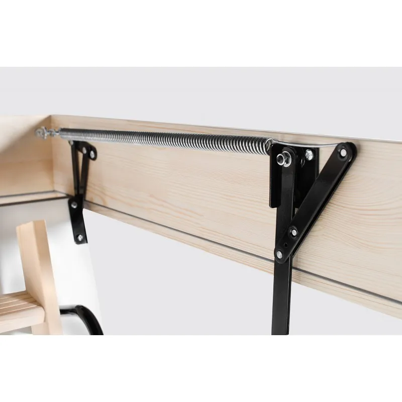 Лестница раздвижная двухсекционная, изготовлена из сосны. Термоизоляционная крышка типа "сэндвич" имеет усиленную теплозащиту, облицована с двух сторон ДСП белого цвета. По контуру короба имеется уплотнитель. Все металлические элементы лестницы покрыты порошковой краской, ступени лестницы имеют антискользящие насечки и закреплены в столярное соединение «ласточкин хвост», что позволяет выдерживать нагрузку 150 кг. При раскладывании лестницы нет вылета за пределы короба, что позволяет использовать эту модель лестницы в таких помещениях, где невозможно использовать чердачные лестницы с большим разбегом открытия. Удобна для эксплуатации на большой высоте. Деревянный стержень для открывания лестницы в комплекте..
