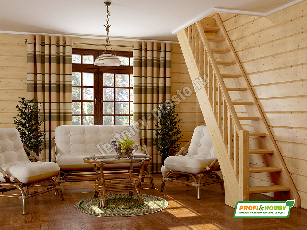 Базовый комплект включает в себя деревянные элементы лестницы и ограждения без какого-либо покрытия. Ограждение можно установить слева или справа. Увеличить высоту лестницы можно установив снизу подиум, точная подгонка высоты под необходимые параметры осуществляется засчет регулировки верхнего шага лестницы.