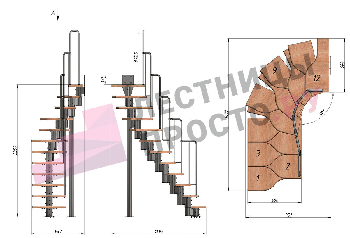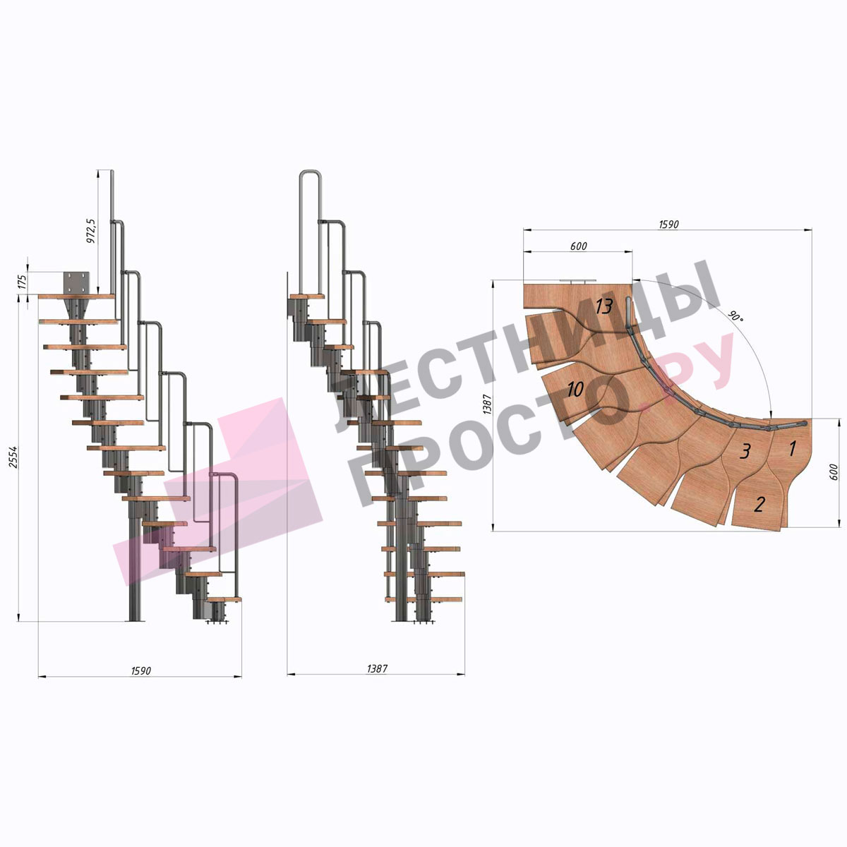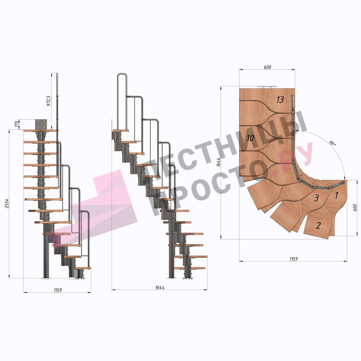 | Лестница Prosto Urban Grey г-образная гусиный шаг 600 мм, h234-336 см (13 ступеней) |