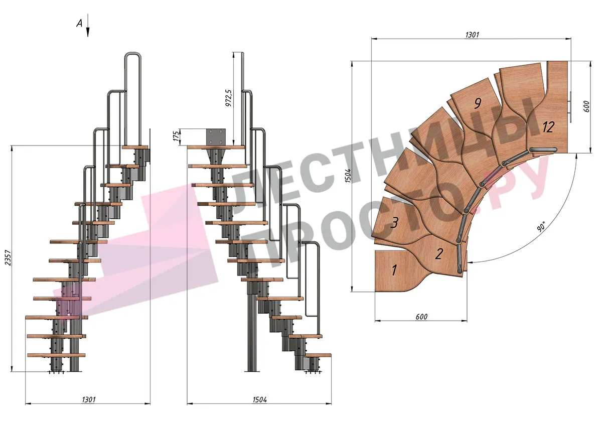 Лестница Prosto Urban Grey г-образная гусиный шаг 600 мм/ Ступени из берёзы мультиплекс