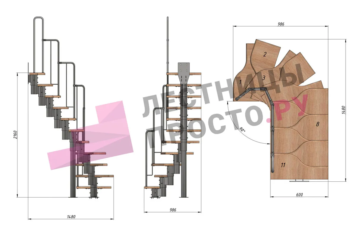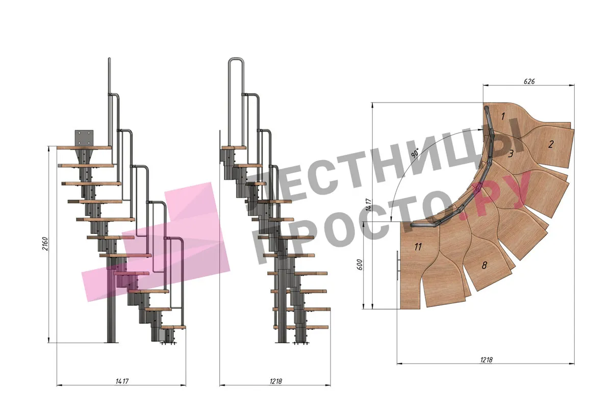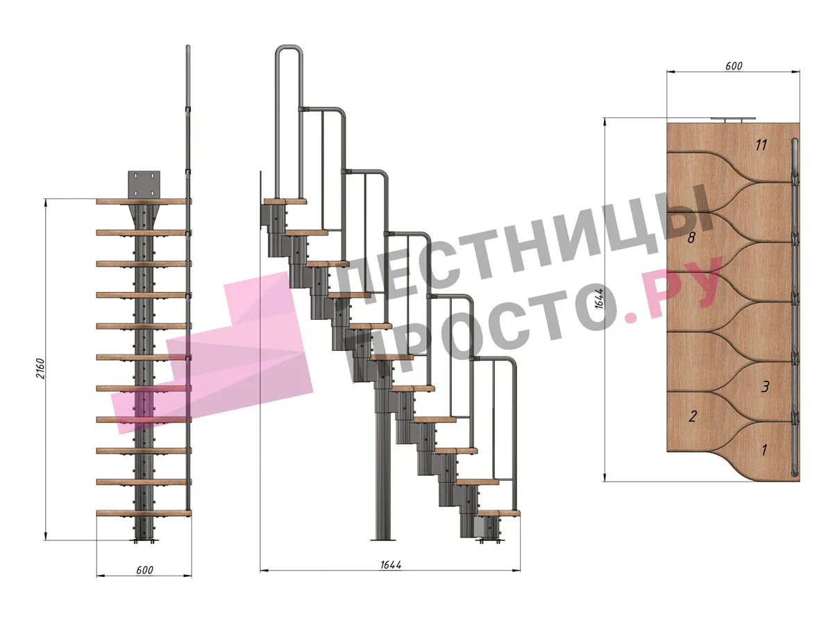 | Лестница Prosto Urban White гусиный шаг 600 мм, h216-312 см (12 ступеней), дуб |