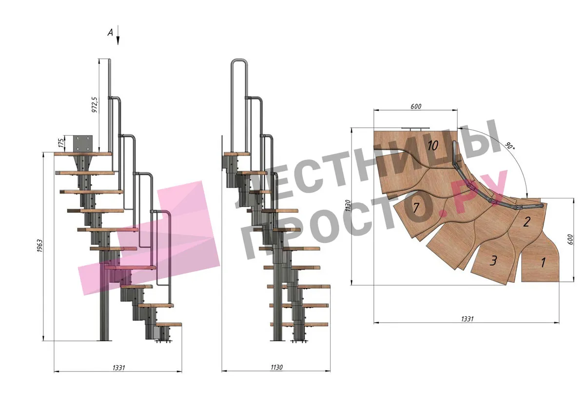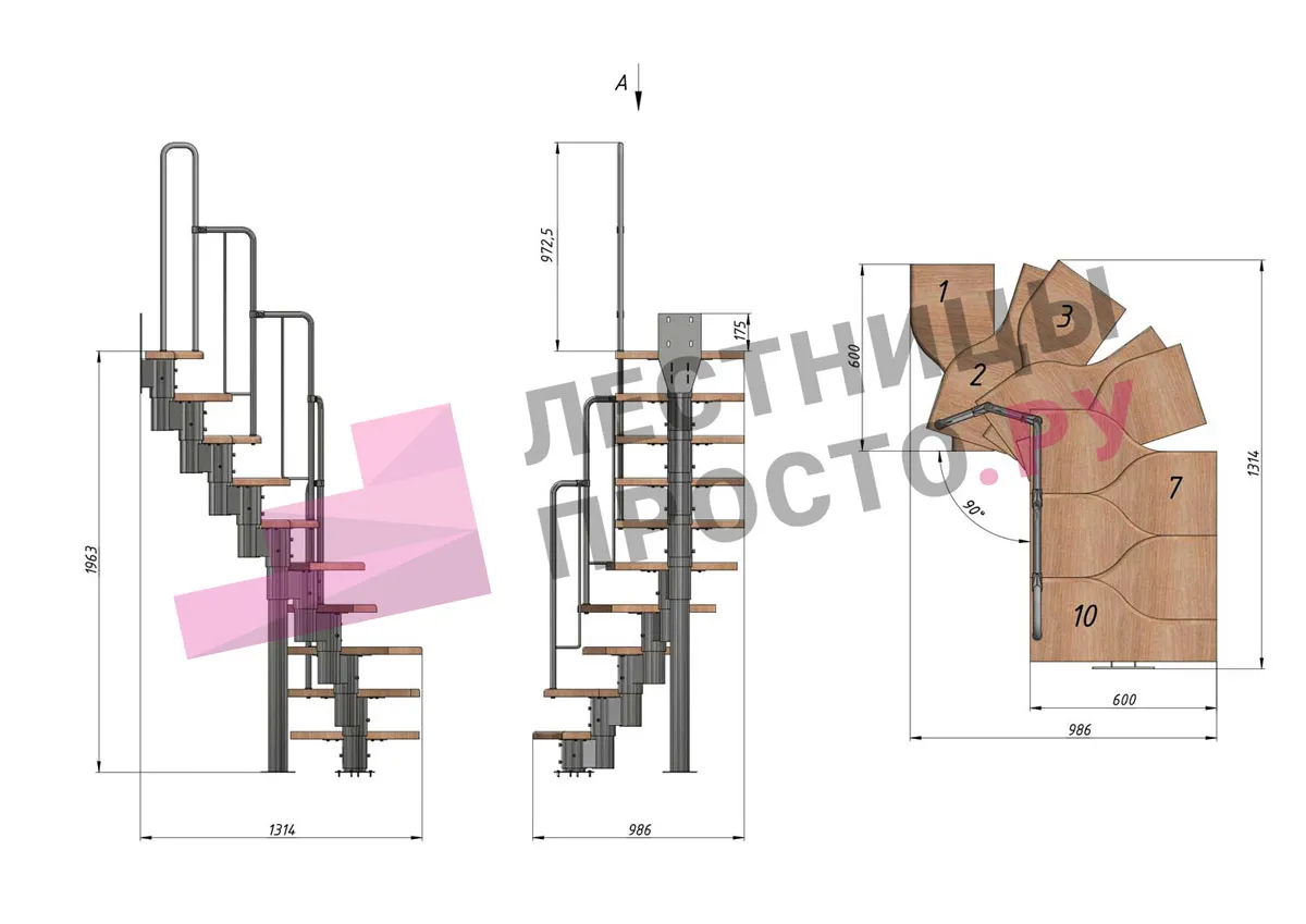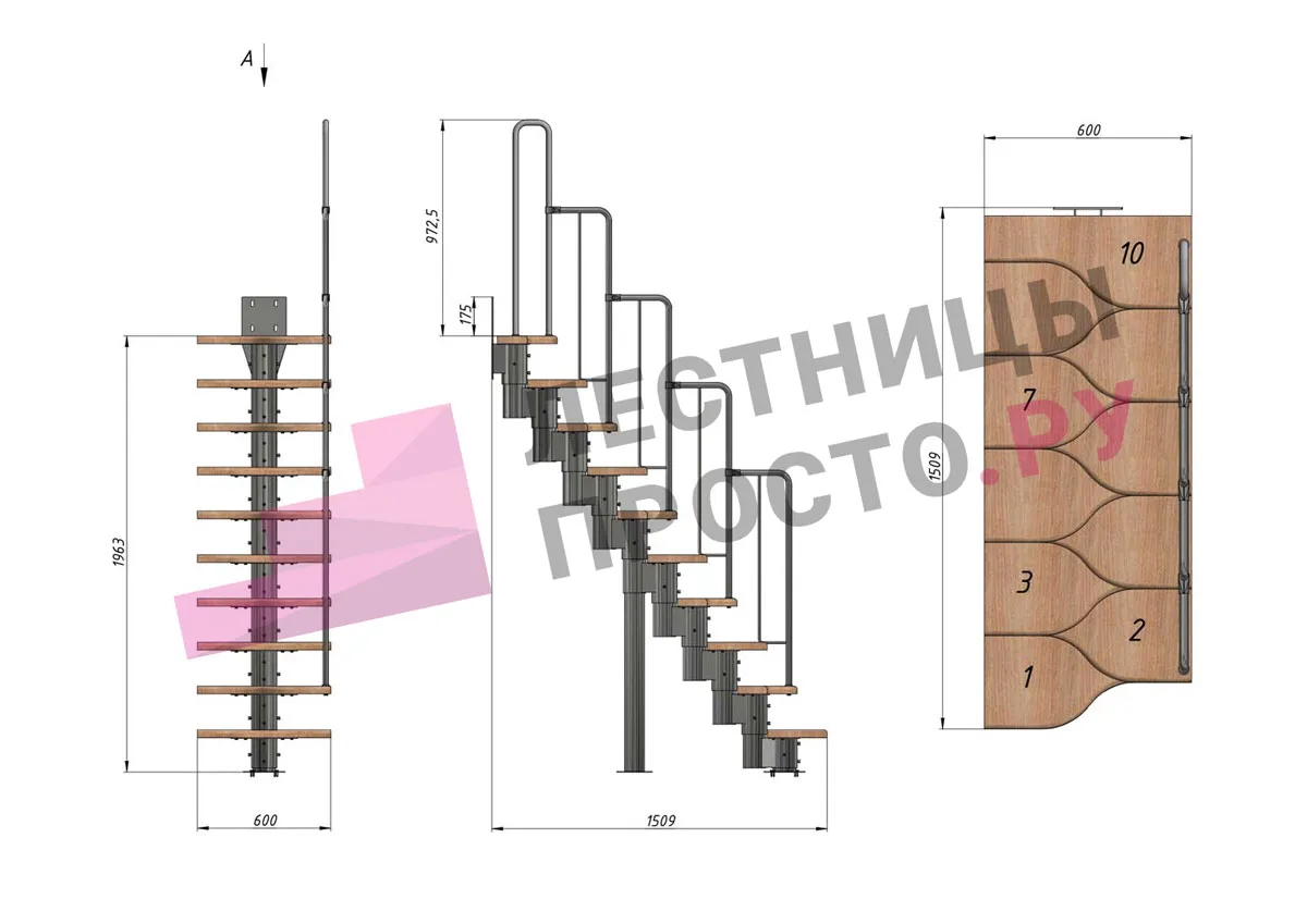 | Лестница Prosto Urban White гусиный шаг 600 мм, h180-264 см (10 ступеней), бук |