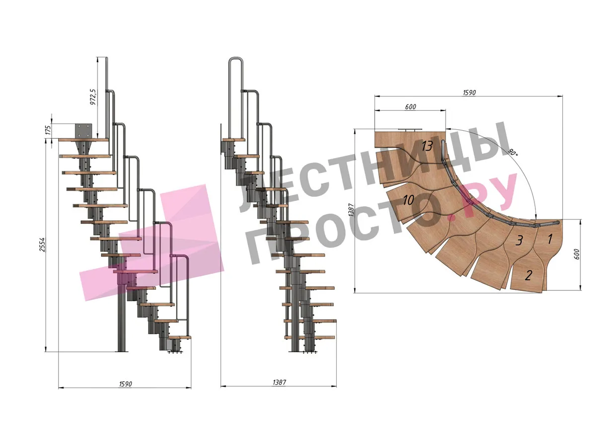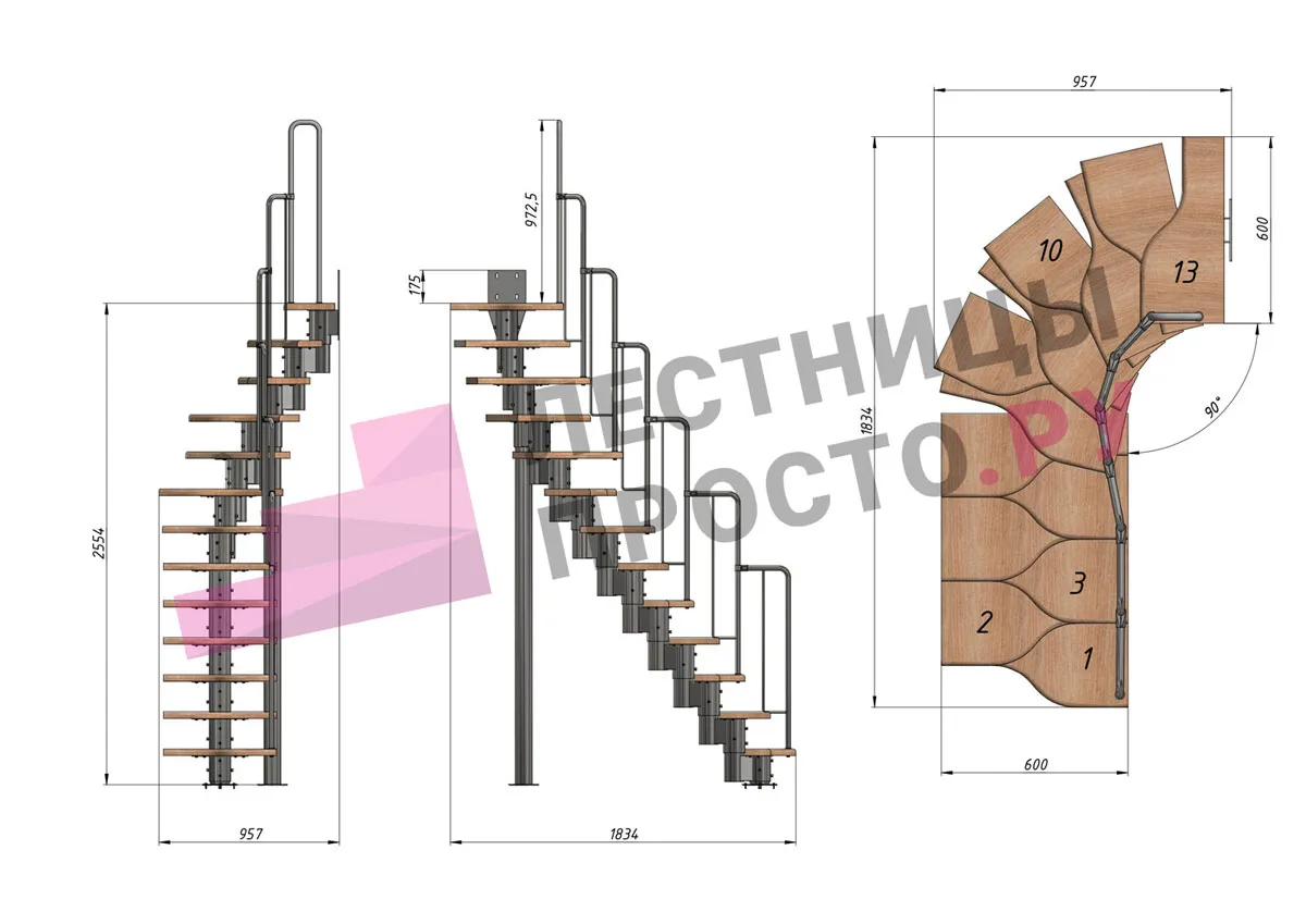 | Лестница Prosto Urban White гусиный шаг 600 мм, h234-336 см (13 ступеней), бук |