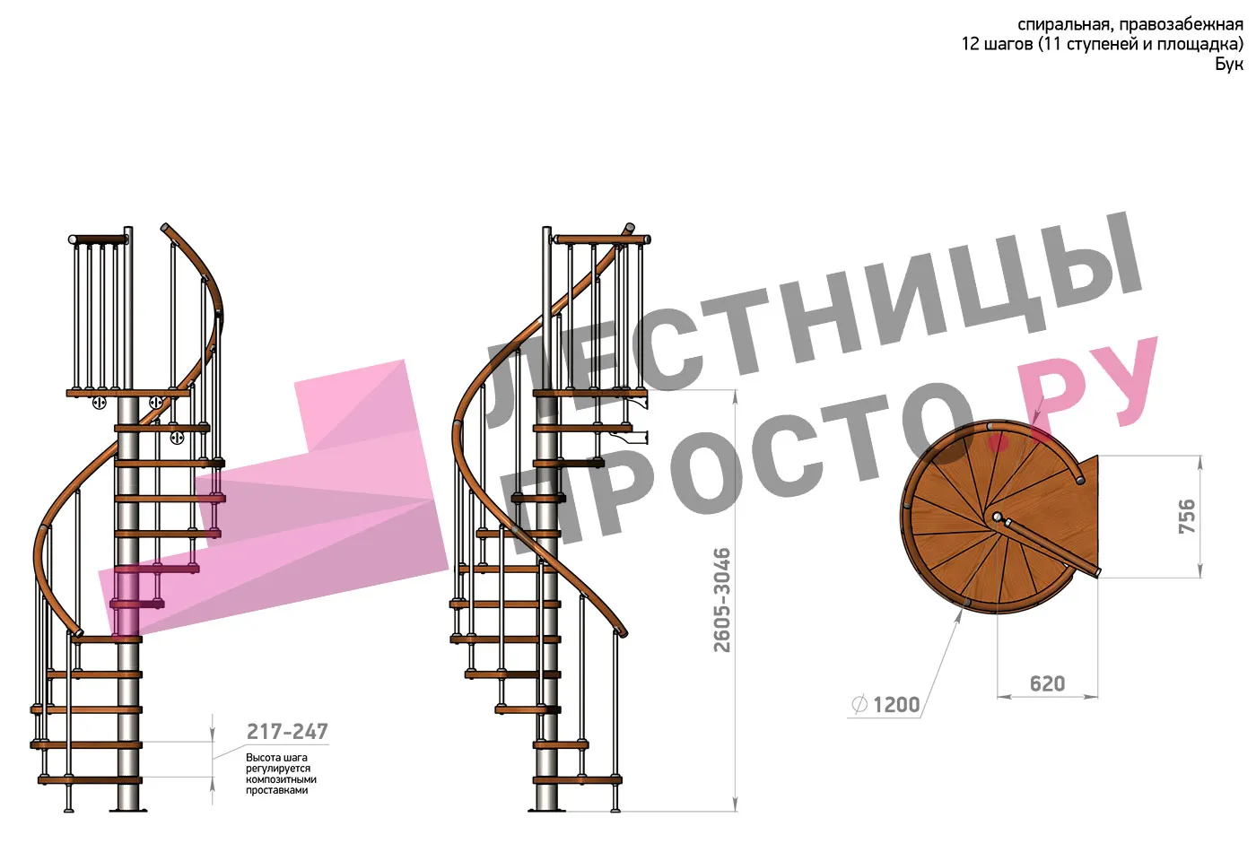 Решение о направлении поворота принимается при сборке - универсальная конструкция позволяет собрать правозабежную и левозабежную лестницы. Высота ступеней регулируется с шагом 3 мм. в пределах 217-247 мм., благодаря чему, лестница прекрасно подгоняется под необходимую высоту.